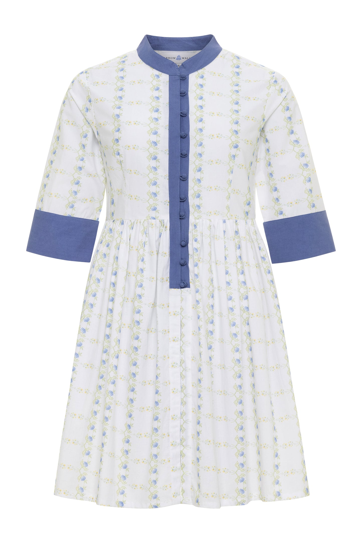 The Cici Short Round Neck Dress in May Day is made from lightweight, breathable, comfortable cotton. It features a delicate watercolor floral print in soft blue and yellow hues, evoking the beauty of springtime blooms. Our classic relaxed silhouette with round neckline and relaxed waist is perfect for day or night. French blue cuffs and placket add sophistication to classic style.