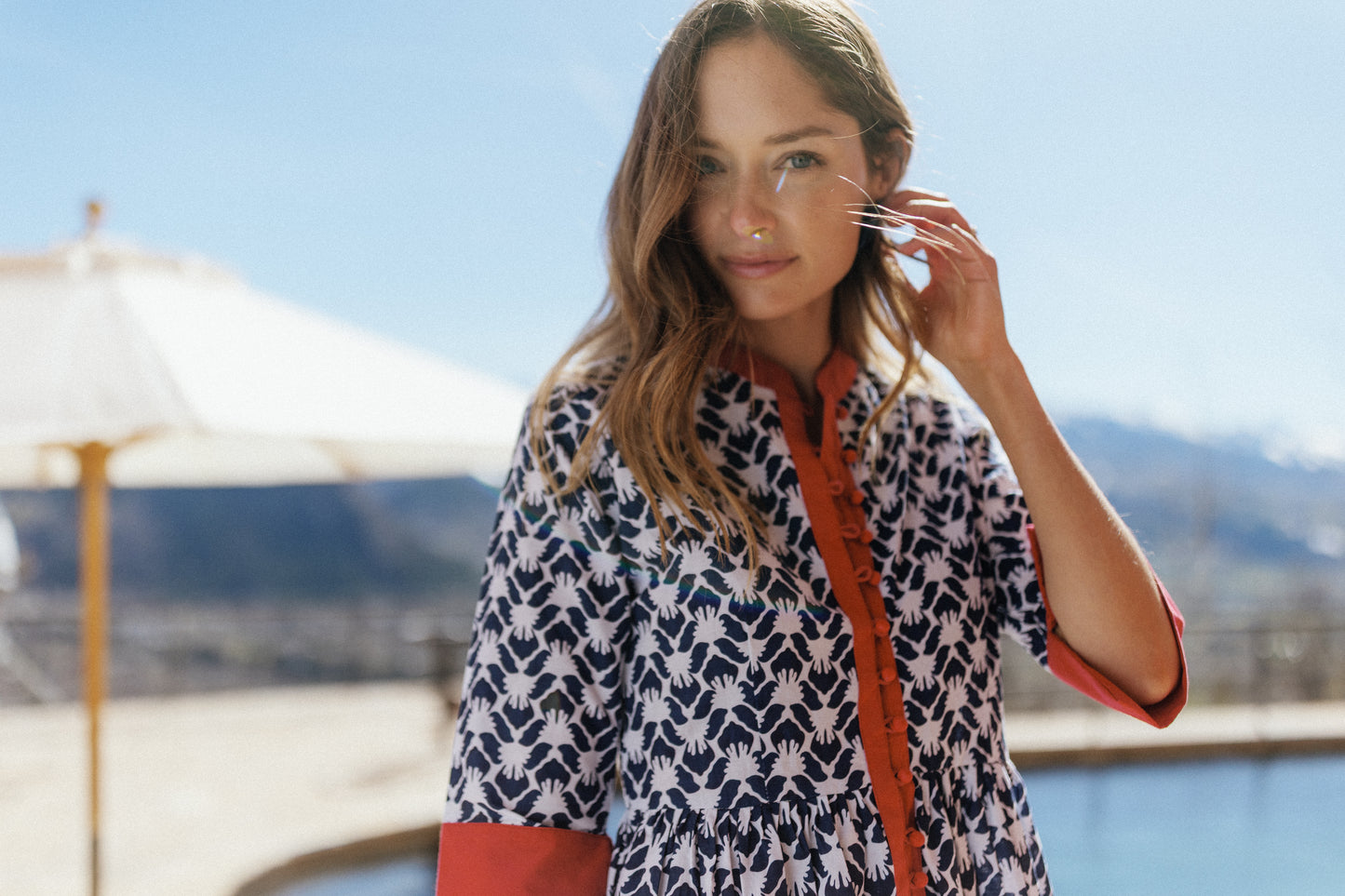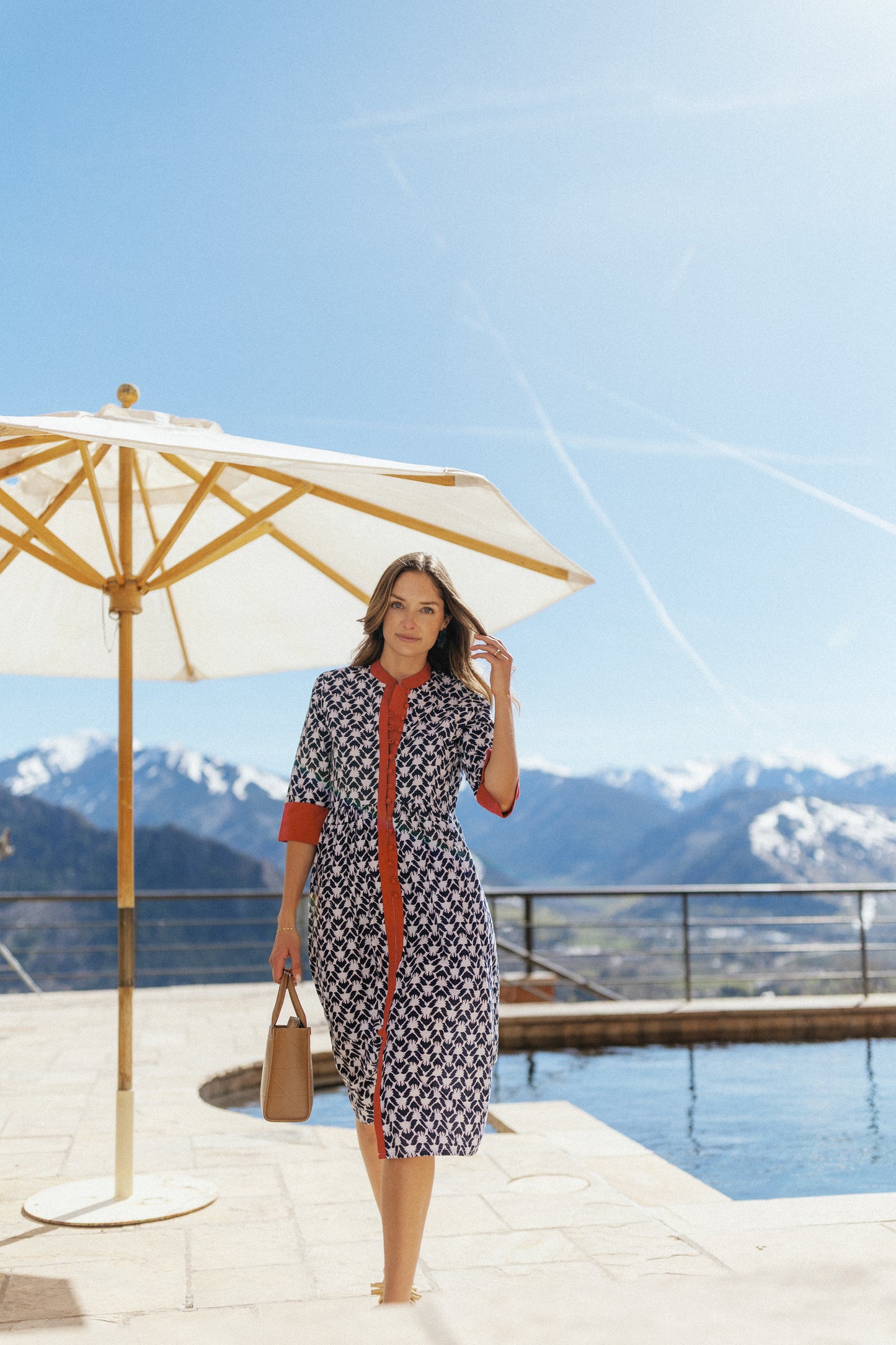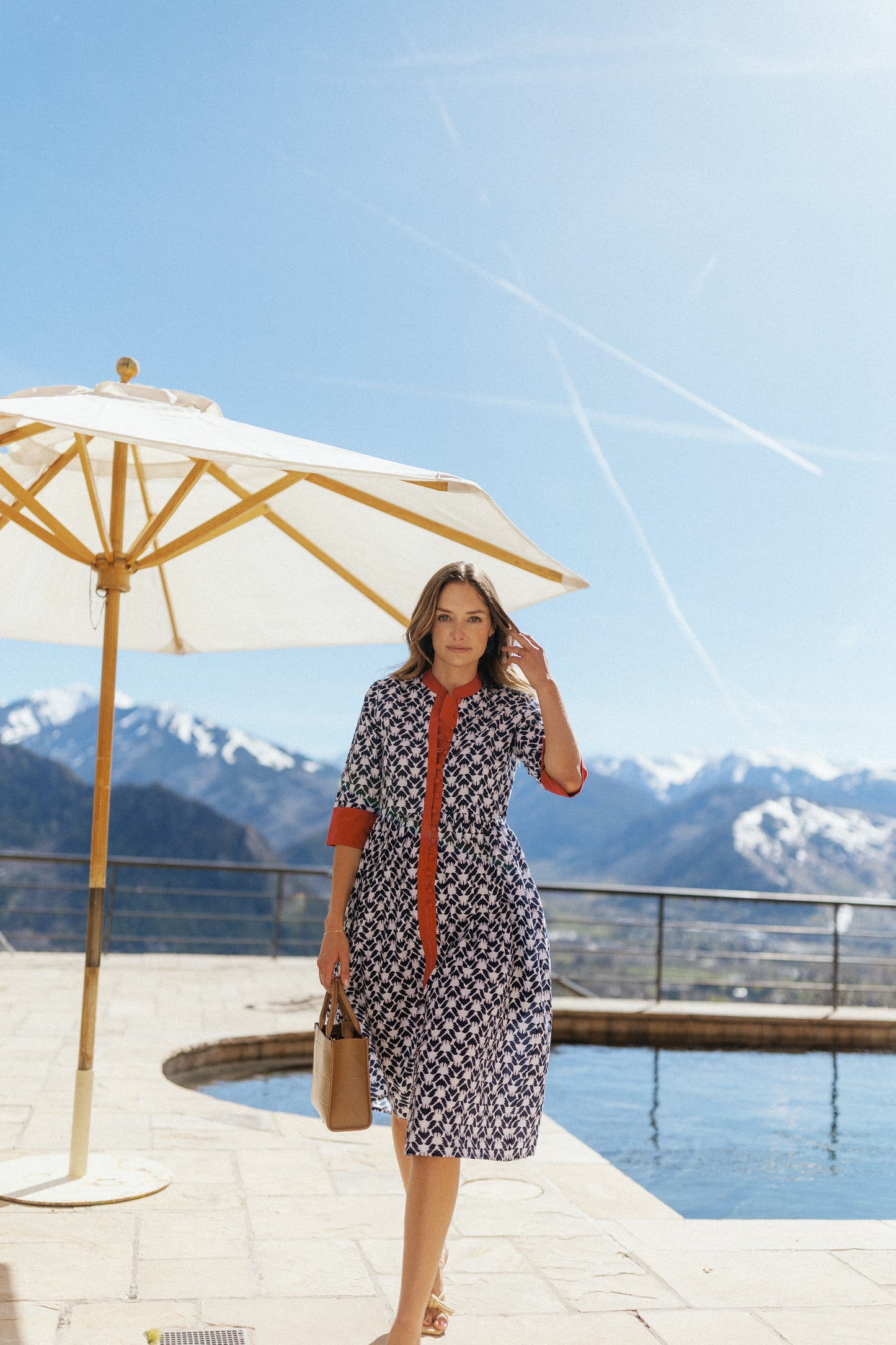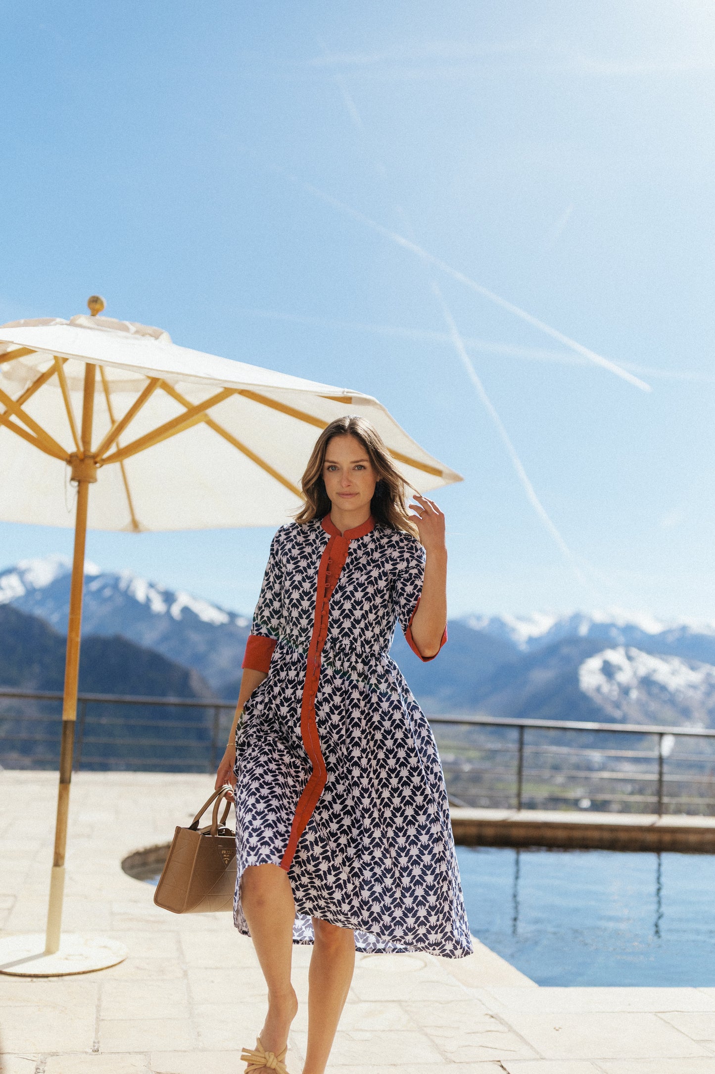 The Cici Midi Dress in Palmetto Navy features a bold contrast of navy and white, accented with a vibrant red trim. The button-down front, structured round collar, and flowing silhouette create a flattering and versatile look—perfect for both casual outings and more upscale occasions.